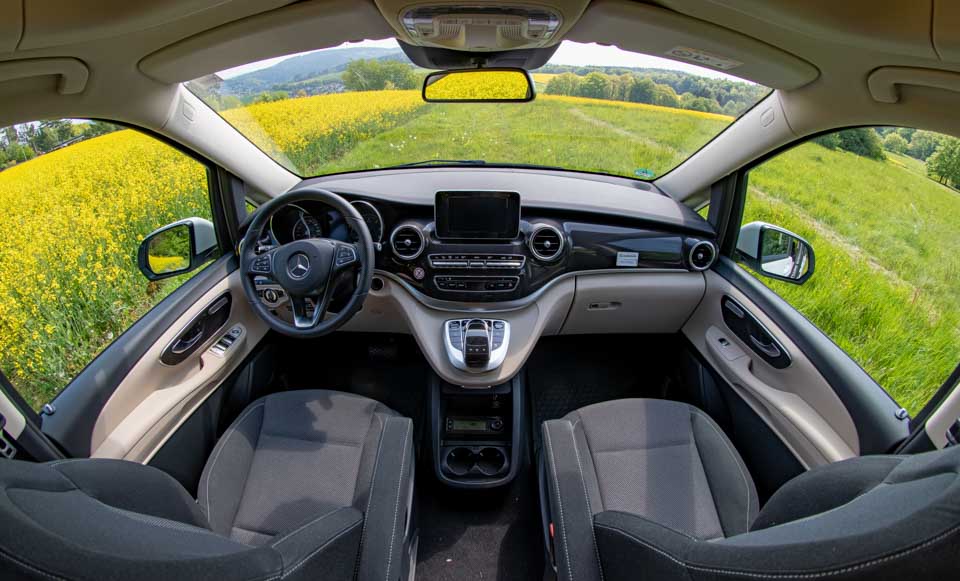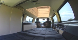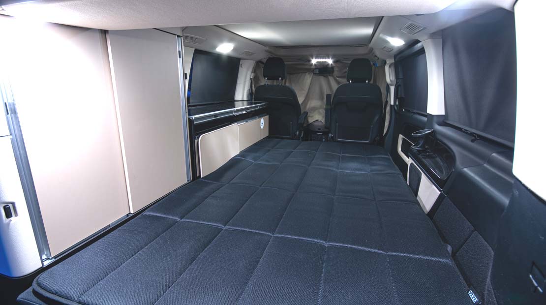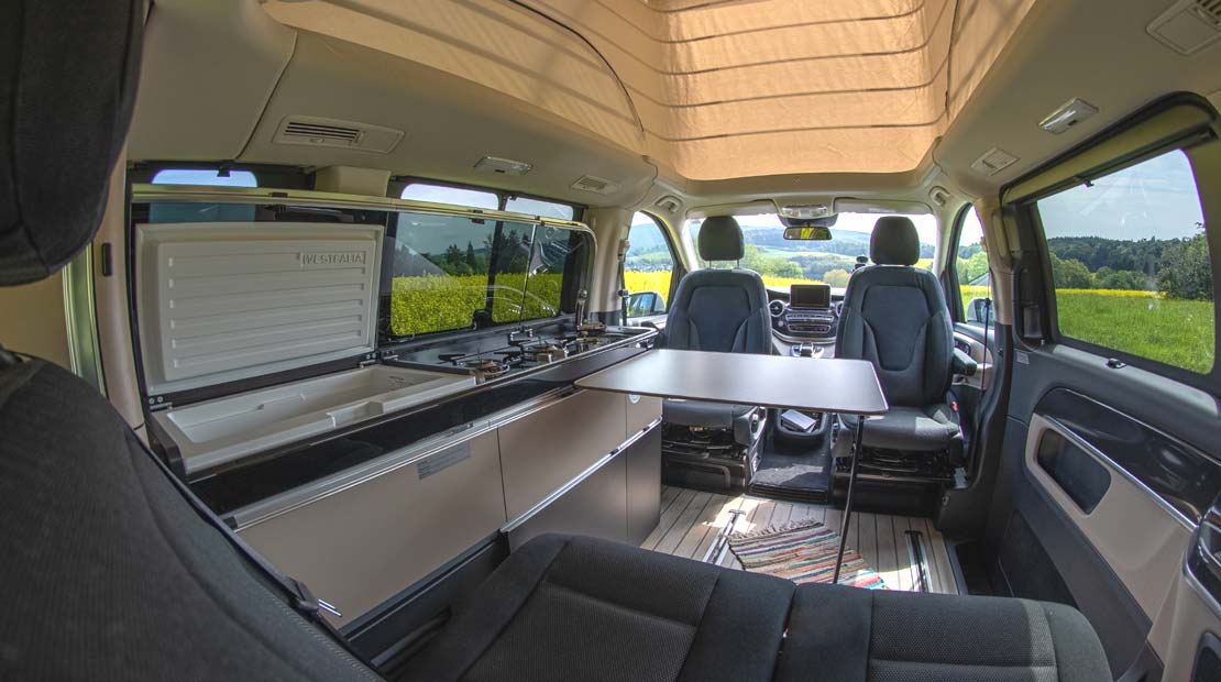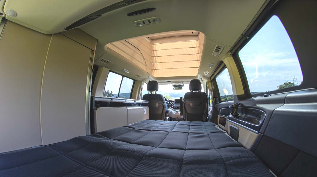 El interior de la Mercedes Marco Polo se puede transformar en un cómodo dormitorio para hasta cuatro personas en poco tiempo. El techo elevable, ya sea manual o automático, ofrece un amplio espacio para dormir para dos adultos, mientras que los asientos traseros se pueden abatir para obtener una gran superficie de descanso para dos personas más en un abrir y cerrar de ojos. Para mayor comodidad y privacidad, cuenta con estores opacos en todas las ventanas. Así, podrás disfrutar de la noche en total tranquilidad, sin importar dónde te encuentres.