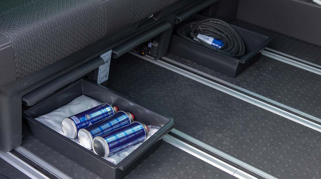 La VW California Beach destaca por sus elementos de vivienda inteligentemente integrados, como un hornillo de gas extensible, una nevera (no fija) y un amplio espacio de almacenamiento. Con sus cinco asientos, no solo es ideal para escapadas de fin de semana, sino también como un vehículo versátil para el día a día.