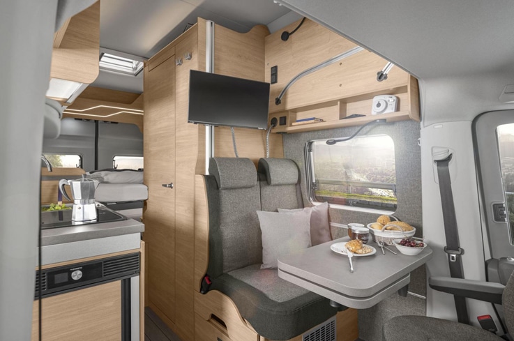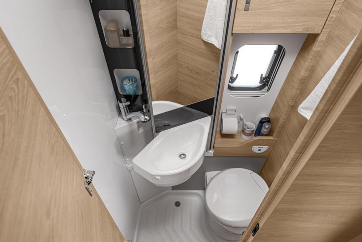 Knaus Boxdrive 600XL erbjuder en särskilt mysig och hemtrevlig inredning med varma trätoner och ett stämningsfullt belysningskoncept. Det konvertibla badrummet kan enkelt omvandlas till en duschkabin med magnetlås och ett vikbart handfat. Jämfört med Grand California har även större sängar installerats här.
