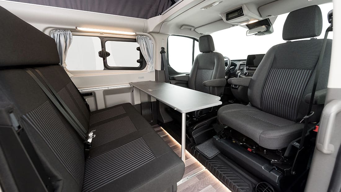 Om du älskar äventyr men inte vill kompromissa med komfort och ordning och reda, bör du hyra en Ford Nugget. Med sin smarta rumslayout liknar Ford Camper en liten lägenhet. Vardagsrummet bakom förarstolarna inbjuder till avkoppling och umgänge, medan köket i bakre delen är välutrustat: med kylskåp, två gasspisar, diskho och praktiska förvaringsutrymmen för bestick och köksredskap. Det bakre öppningsbara pop-top-taket i Ford Nugget ger också full ståhöjd i köket. Förutom den väl genomtänkta utrustningen är denna husbil kompakt i storlek, vilket gör den idealisk för städer, smala gator och slingrande landsvägar. Det finns också plats för upp till fem personer – perfekt för familjer eller för par, singlar och grupper av vänner. Detta gör Ford Nugget till en flexibel och praktisk följeslagare för resor av alla slag.