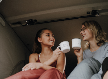 chilling together in camper bus in england